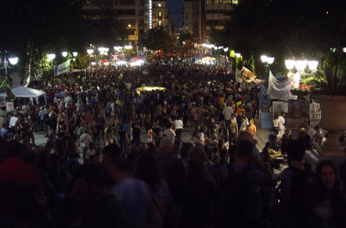 Milhares de pessoas reúnem-se diariamente na Syntagma para discutir os próximos passos. Os paralelos com a Ágora (antiga praça pública nas cidades da Grécia antiga) ateniense clássica, que se reunia a algumas centenas de metros, são impressionantes. Os que desejam falar recebem um número e são chamados à plataforma caso esse número apareça, um lembrete de que muitos dos titulares dos cargos na clássica Atenas eram seleccionados por lotes. Os oradores têm um tempo de antena restrito de dois minutos, a fim de permitir a contribuição de um maior número possível de pessoas. A assembleia é gerida com eficiência sem os habituais apartes dos discursos públicos. Os temas abordados vão desde assuntos organizacionais a novos formas de resistência e solidariedade internacional, e alternativas às medidas catastroficamente injustas. Nenhuma questão está além de proposta e disputa. Em debates semanais bem organizados, economistas convidados, advogados e filósofos políticos apresentam alternativas para enfrentar a crise.
