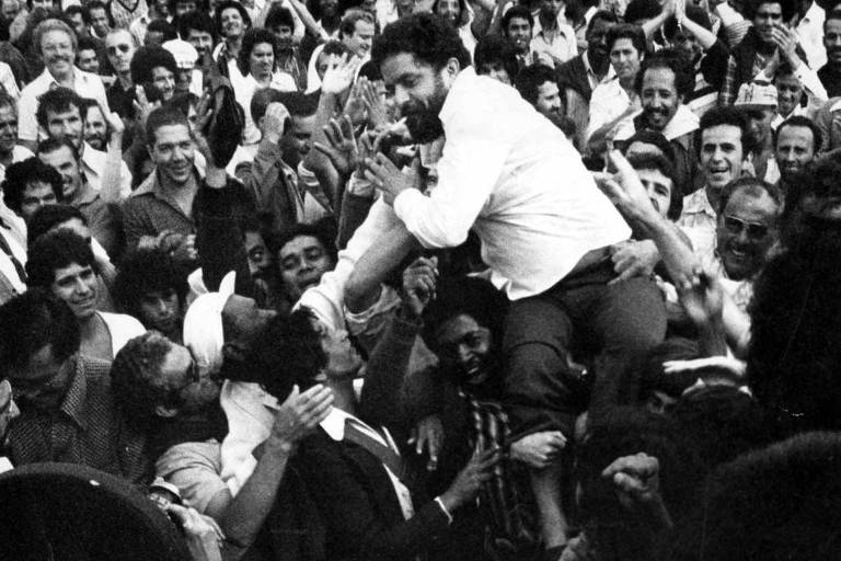 Lula recebido em apoteose pelos operários depois da libertação das prisões da Ditadura.
