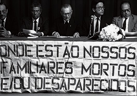 O Arcebispo de S. Paulo (ao centro) em sessão de protesto contra a morte de presos políticos durante a Ditadura.