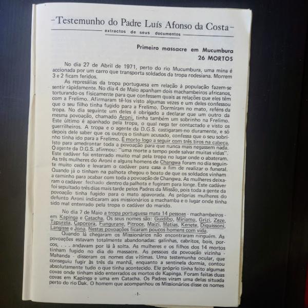 Caderno de 34 páginas de impressão artesanal publicado em junho de 1973, onde consta o testemunho do Padre Luís Afonso da Costa e extratos dos seus documentos. A introdução é assinada por "Um grupo de defensores da paz". Espólio de Mariana Carneiro.