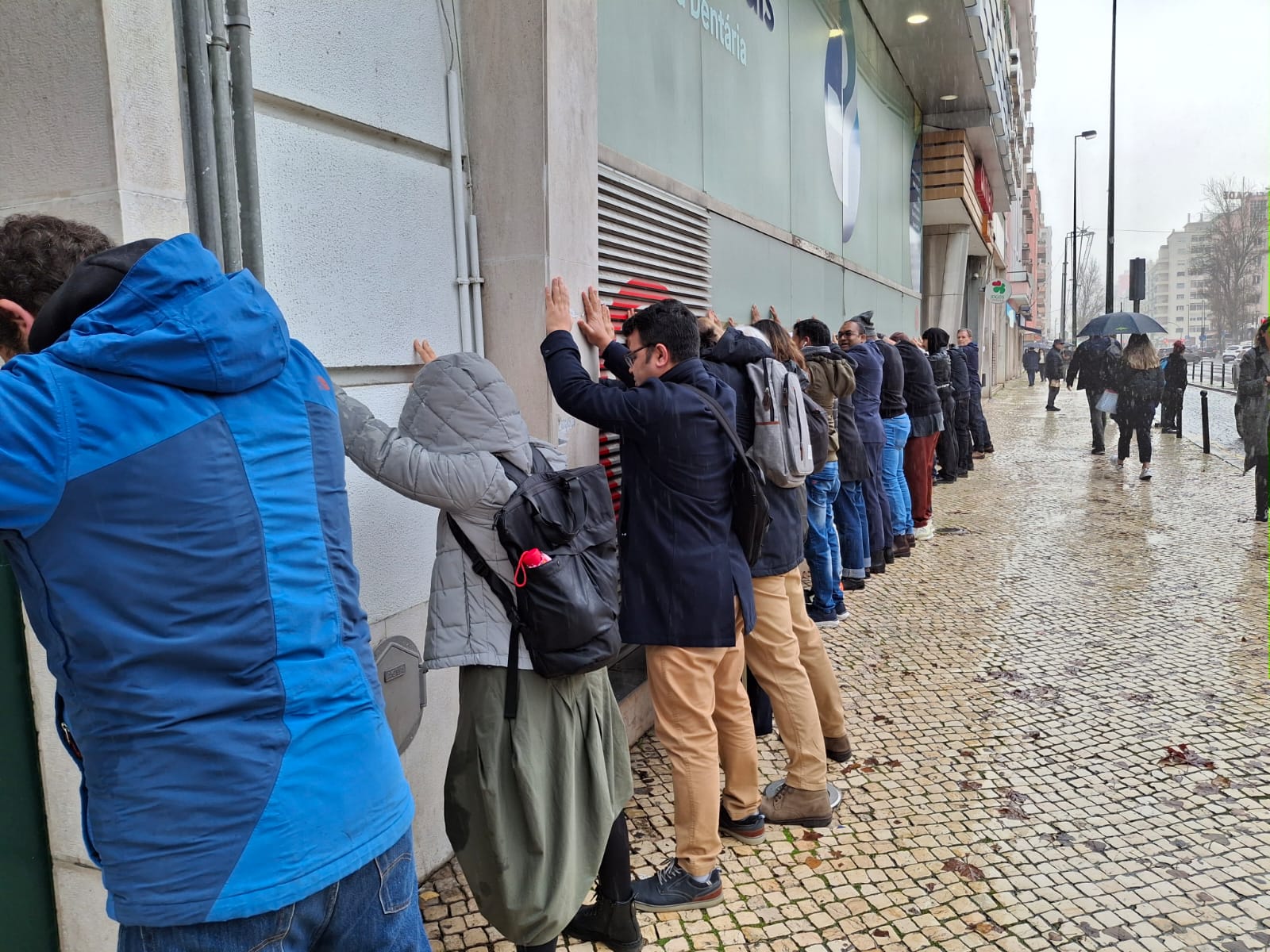 Chuvisca levemente. Quem passa ao longo do passeio estranha as cerca de 30 pessoas encostadas com as mãos à parede, mas quem esteve atento às notícias nas últimas semanas terá um ponto de referência. Só que ali, na Avenida de Roma, em Lisboa, as rusgas policiais não são comuns e ninguém está habituado a ver pessoas encostadas à parede.