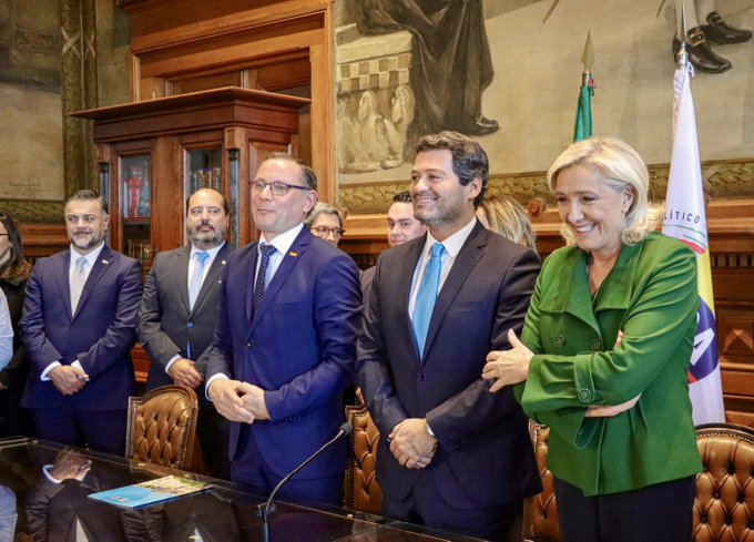 Por exemplo , o líder da extrema-direita portuguesa recebeu no Parlamento nacional em novembro de 2023 Tino Chrupalla (dirigente da AfD) e Marine Le Pen (da União Nacional francesa) tendo considerado estes “um excelente exemplo e uma honra para todo o partido”. Como o Expresso salientava na altura, o dirigente ultra-nacionalista veio ao nosso país apresentar a União Europeia como “um sorvedouro orçamental” que só prejudicaria os contribuintes alemães, concluindo o semanário “ora Portugal é um dos países mais beneficiados pelos fundos da coesão, mas Ventura não se pronunciou sobre este aspeto”.
