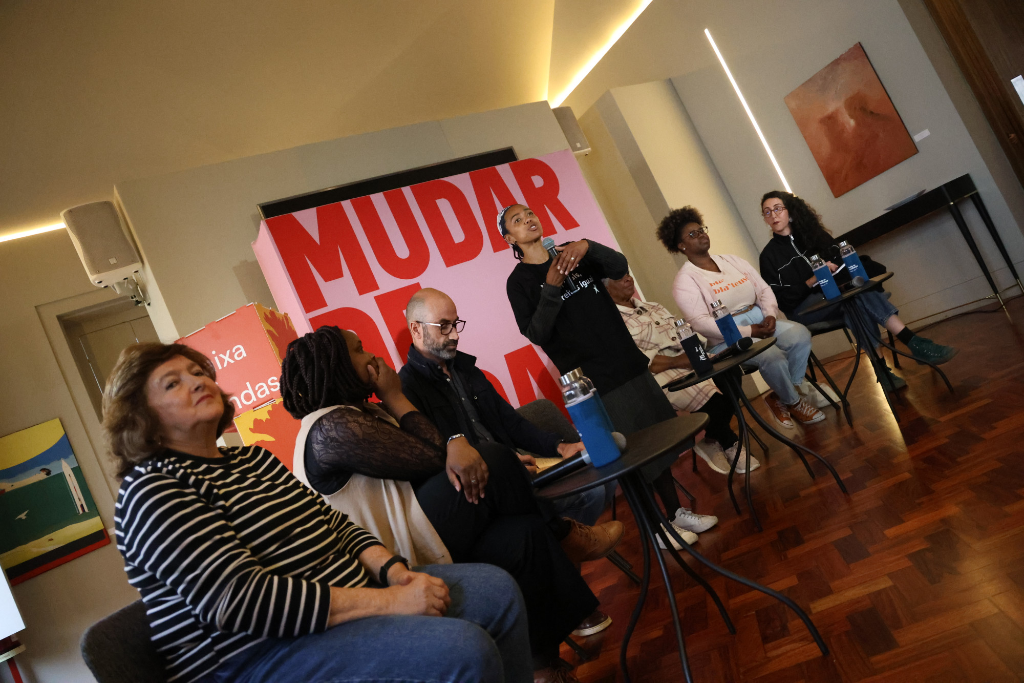 Numa sala cheia, a sessão é interrompida por mais duas mulheres que vieram do Bairro das Marinhas do Tejo, em Santa Iria da Azóia, para contar a sua história, “mas os transportes não são fáceis”. Apesar disso, acabam por se juntar ao painel.