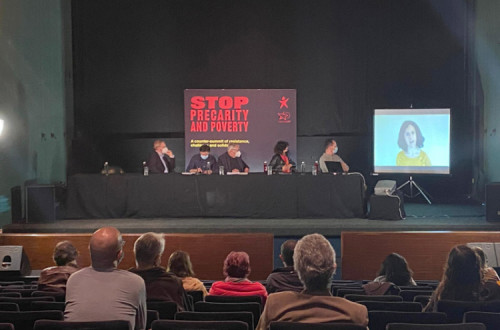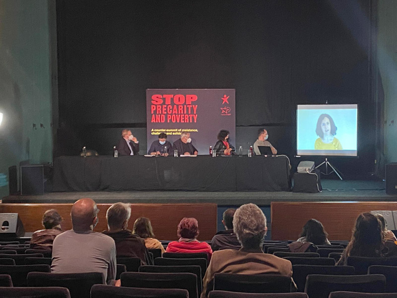 Sem poder estar presente fisicamente nesta sessão, a eurodeputada Manon Aubry, presidente do grupo parlamentar da Esquerda, enviou uma mensagem de saudação à contracimeira, sublinhando a sua importância num momento em que “os ricos nunca foram tão ricos - e conseguiram enriquecer ainda mais durante a crise -, enquanto os pobres nunca foram tão pobres”. Ao ponto de assistirmos na Europa à situação em que “os mais pobres fazem entregas de comida e ao mesmo tempo não têm dinheiro para alimentar as suas famílias”, resumiu, apelando à defesa de um “salário mínimo decente a nível europeu”.