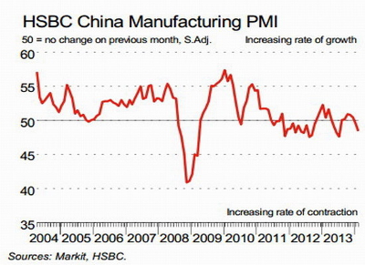 O índice Markit caiu 48,1 pontos e é o resultado mais baixo desde julho do ano passado. O índice, que mede a opinião dos executivos em matéria de empregos, novas encomendas e preços, caiu para 47,3 pontos, o mais baixo em 18 meses. Estes números são o resultado dos enormes volumes acumulados na China no período da euforia. Uma série de relatórios assinala o excesso de stocks existente em muitos sectores chave como o aço, o ferro, o alumínio, o cimento, o carvão, os painéis solares e a construção naval, entre outros.