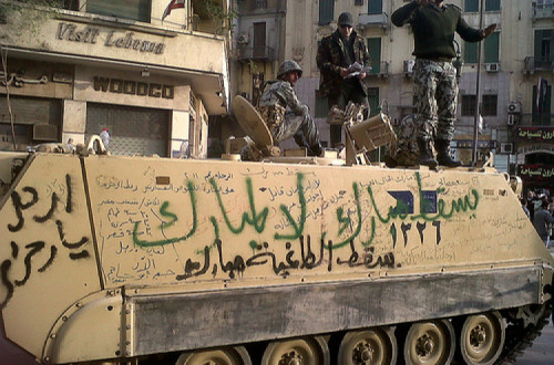Os soldados que conduzem os tanques, em uniforme de combate, sorridentes e às vezes aplaudindo os passantes, não fizeram qualquer esforço para apagar das laterais dos tanques os graffiti ali pintados com tinta spray. “Fora Mubarak! Vai-te embora, Mubarak!” e “Mubarak, o teu governo acabou” aparecem grafitados em praticamente todos os tanques que se vêem pelas ruas do Cairo. Sobre um dos tanques que circulavam pela Praça da Liberdade, vi um alto dirigente da Fraternidade Muçulmana, Mohamed Beltagi. Antes, andei ao lado de um comboio de tanques próximo de Garden City, subúrbio do Cairo, onde as multidões subiram aos tanques para oferecer laranjas aos soldados, aplaudindo-os como patriotas egípcios. A nomeação ensandecida e sem sentido de um vice-presidente [o primeiro, em 30 anos, e nomeação que significa que Mubarak desistiu de nomear o filho para substituí-lo no poder (NTs)] e a formação de um “novo” Gabinete sem poder algum, constituído só de velhos conhecidos dos egípcios, evidenciam que as ruas do Cairo viram e vêem o que nem os estrategistas e políticos dos EUA e da União Europeia souberam ver: que o tempo de Mubarak acabou.