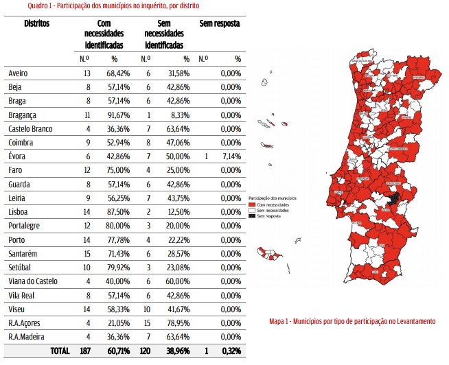 O levantamento indica também que a totalidade do parque habitacional português recenseado como vago (cerca de 735 mil fogos) é largamente superior ao número de famílias com graves carências habitacionais identificadas pelos munícios e que “entre os 187 municípios que identificaram carências habitacionais todos apresentavam, em 2011, um número superior de fogos vagos face às necessidades identificadas”.