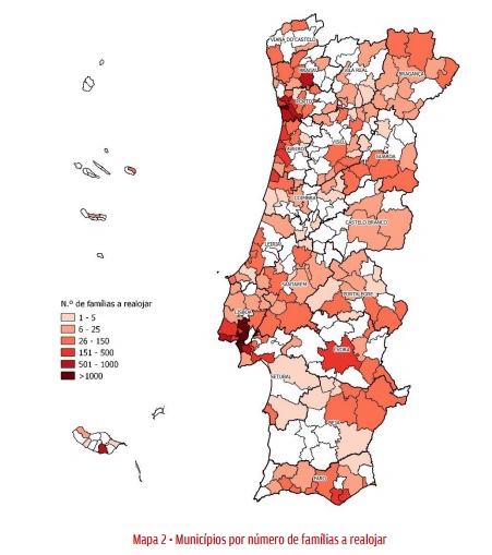 O levantamento permite ainda focos diferentes. Por exemplo, verifica-se que a distribuição das carências de alojamento está presente em todo o território, mas concentra-se sobretudo nas áreas metropolitanas de Lisboa e do Porto, que representam 74% do total das famílias sinalizadas. A Área Metropolitana de Lisboa é a que revela um maior número de agregados familiares que precisam de uma habitação digna (quase 14 mil). Além disto, verifica-se tammbém que os concelhos geograficamente mais próximos de Lisboa e Porto são os que sinalizam mais famílias com carências, estando a Amadora com um peso praticamente igual ao de Lisboa (com 2839 famílias), seguida de Almada (2735) e Loures (2673). Já na área metropolitana do Porto o relatório destacou as maiores necessidades nos municípios de Vila Nova de Gaia (824 famílias), Maia (794) e Gondomar (502).