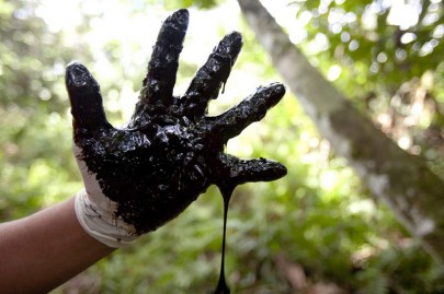 Mão coberta de crude vindo de uma das centenas de poços abertos pela Chevron (antiga Texaco) abandonada na floresta amazónica equatoriana ao pé do Lago Agrio. Foto Rainforest Action Network/Flickr