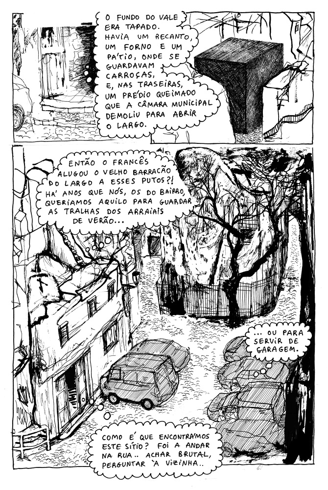 Em 2011 eu ilustrei algumas peças do Miguel Castro Caldas sobre o bairro da Mouraria e o que lá estava a acontecer. Depois fui encontrando textos aqui e ali que podiam funcionar aos quadradinhos. Fui acumulando essas pequenas histórias, sempre na ideia de que não chegavam. Um dia enviei uma parte desse material como proposta para o concurso interno da Chili com Carne. Chama-se “toma lá 500 paus e faz uma BD” (os sócios reúnem-se, pagam as quotas e a associação usa-as assim todos os anos: se tens aí uma BD na gaveta…). Eu ganhei em 2014, mas depois falei com eles: “pá, isto pode ser um livro muito mais interessante, esperem aí um bocadinho…” E pronto, só tiveram que esperar dez anos!