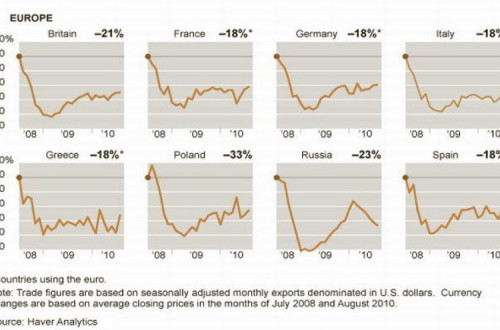 Aquela descida chegou a 40% na China, Reino Unido, Alemanha, Canadá e alcançou 5% em países como Rússia e Coreia do Sul. Como mostra o gráfico do jornal The New York Times, a estagnação que vive o comércio mundial situa esta actividade muito abaixo dos níveis de 2008. Esta situação pode agravar-se com as desvalorizações competitivas que alguns países realizam na chamada guerra das divisas que se desenvolve em várias frentes.