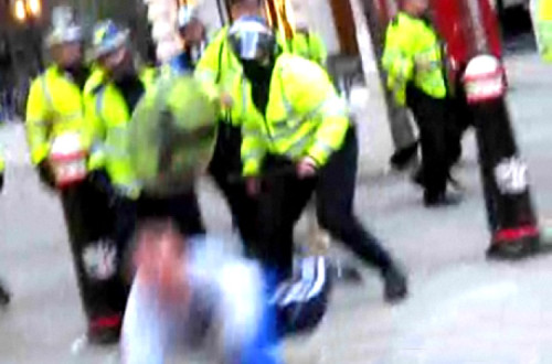 Momento em que a polícia agride pelas costas o vendedor de jornais que viria a morrer segundos depois. Imagem Guardian