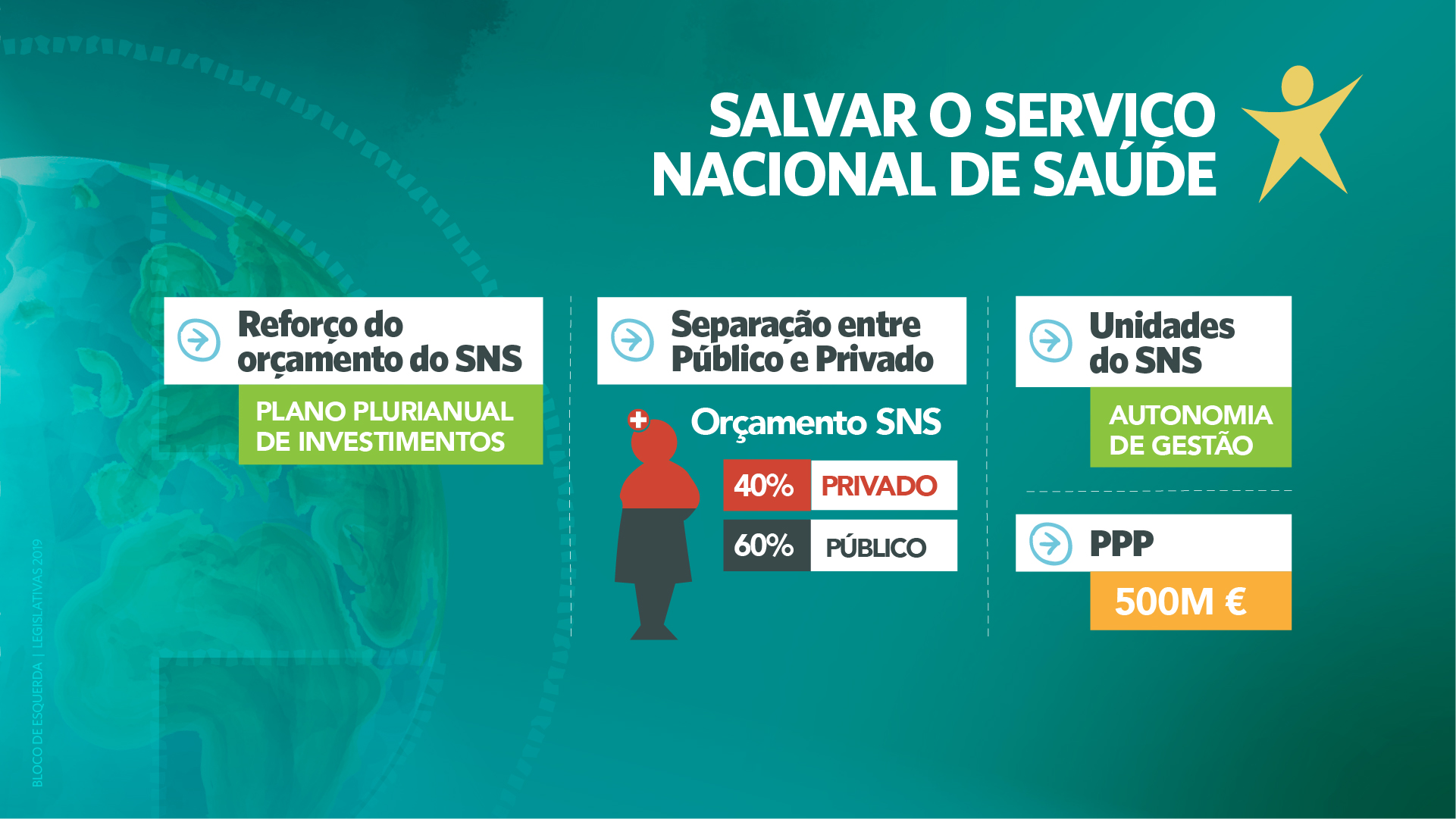Para ter um SNS “universal, geral, gratuito, público e de qualidade”, o Bloco pensa não só que o seu orçamento deve ser maior, como também que se devem utilizar os seus recursos de forma mais racional “em vez de gastar milhares de milhões comprando prestações de serviços a privados” e que devem tanto haver mais profissionais a trabalhar quanto melhores condições de trabalho. Há, ainda, que remover barreiras de acesso aos cuidados de saúde, sejam elas taxas moderadoras ou listas de espera para consultas e cirurgias.