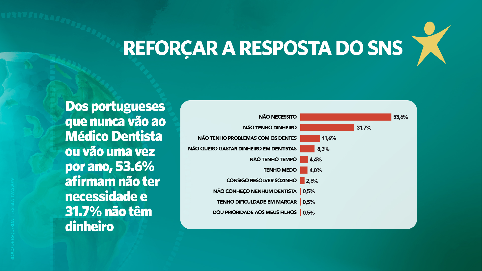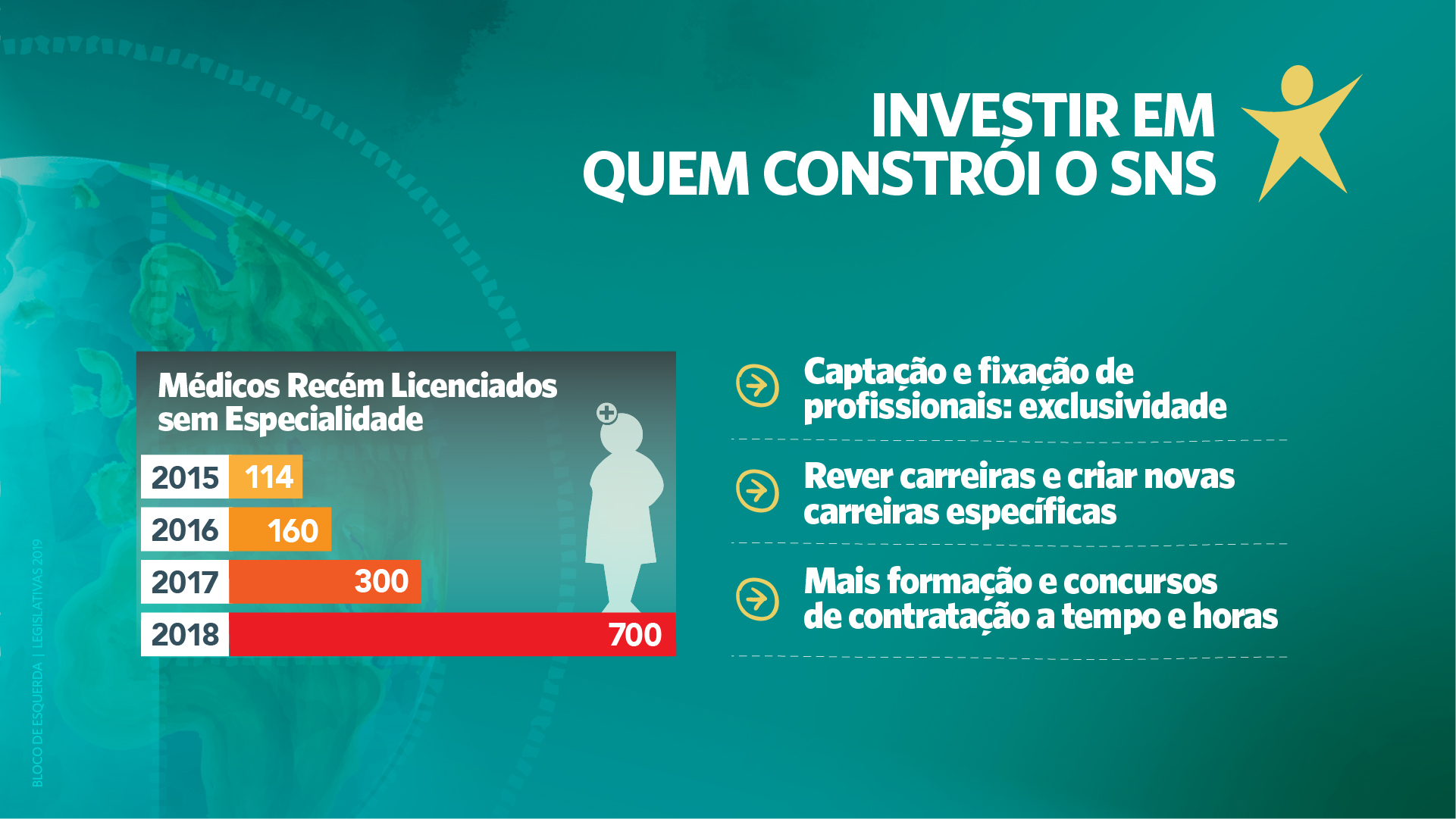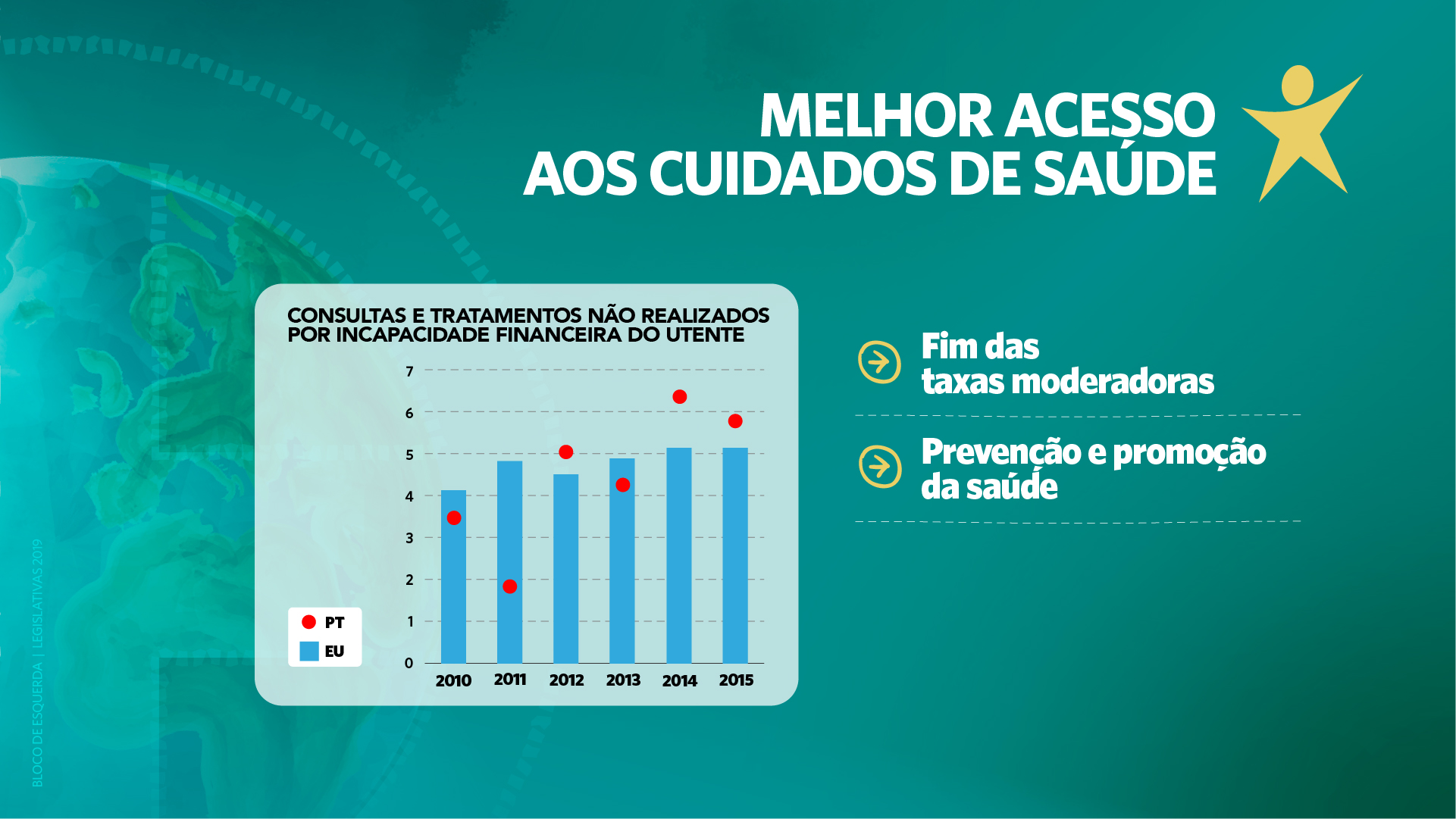 - eliminação de barreiras de acesso à saúde como o pagamento de taxas moderadoras ou do transporte não urgente e o combate às listas de espera para consultas e cirurgias com a contratação e fixação de mais profissionais no SNS;