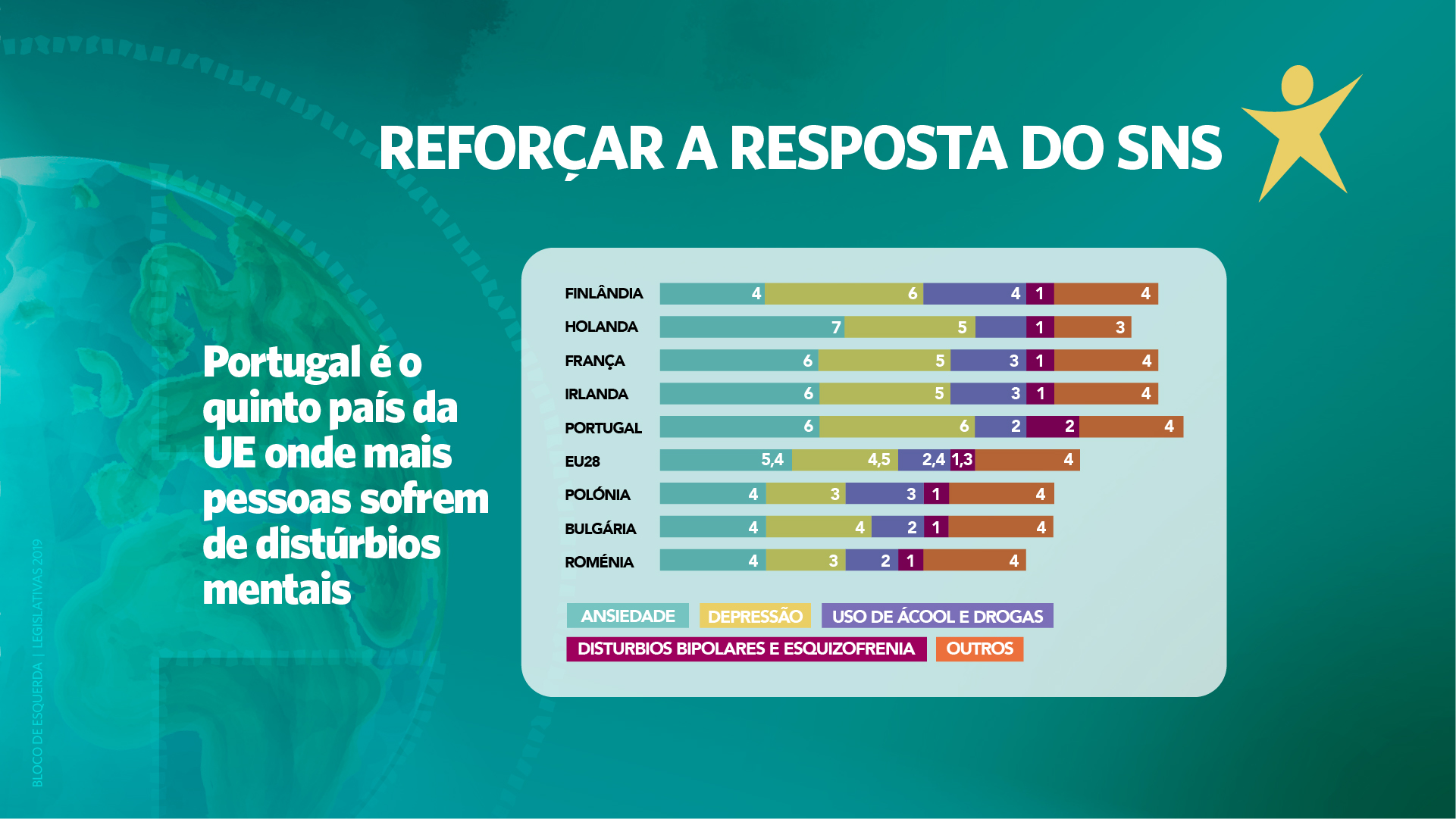 - reforço das equipas multidisciplinares de saúde mental nos Cuidados de Saúde Primários, com aumento significativo do número de psicólogos, e cumprimento do Plano Nacional de Saúde Mental dotando-o com o orçamento necessário e implementando equipas de saúde mental na comunidade.