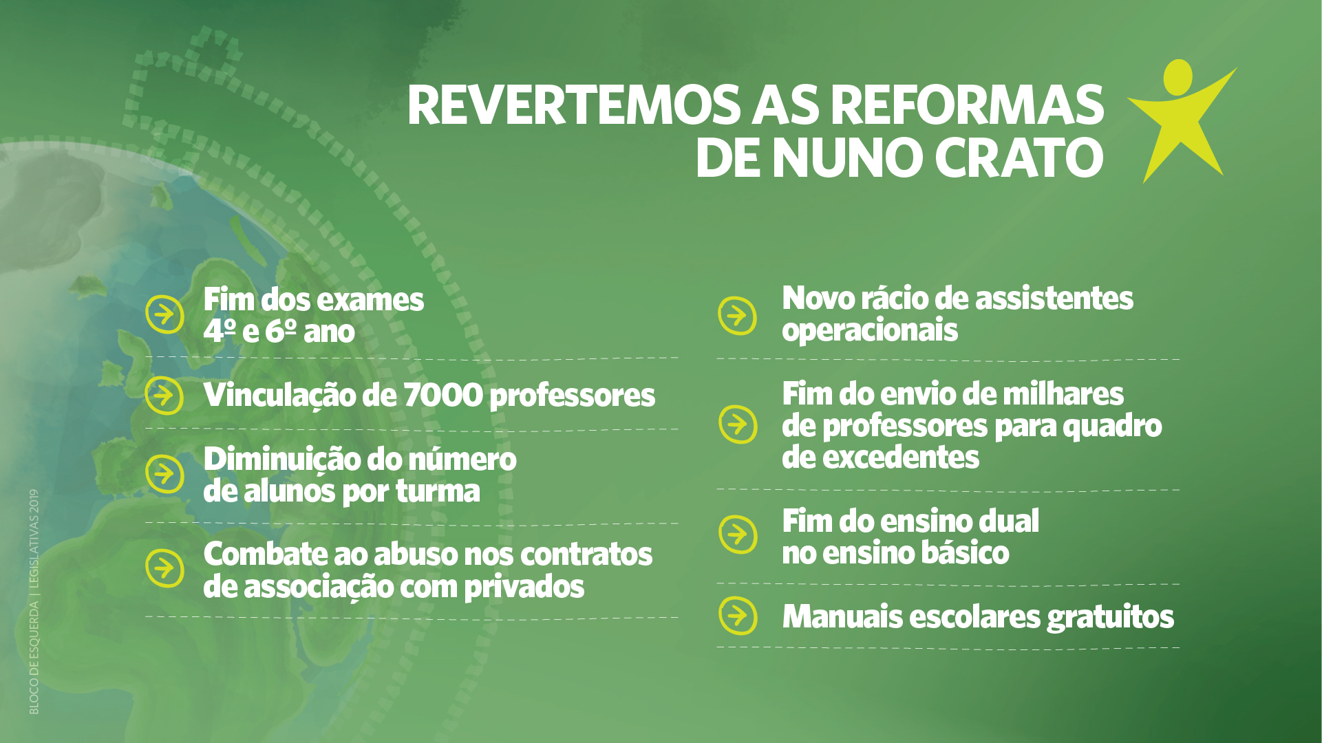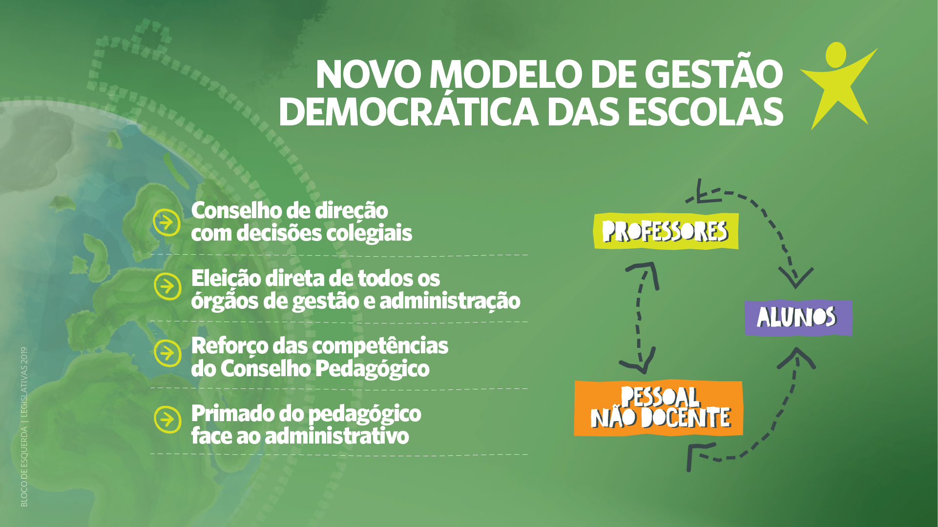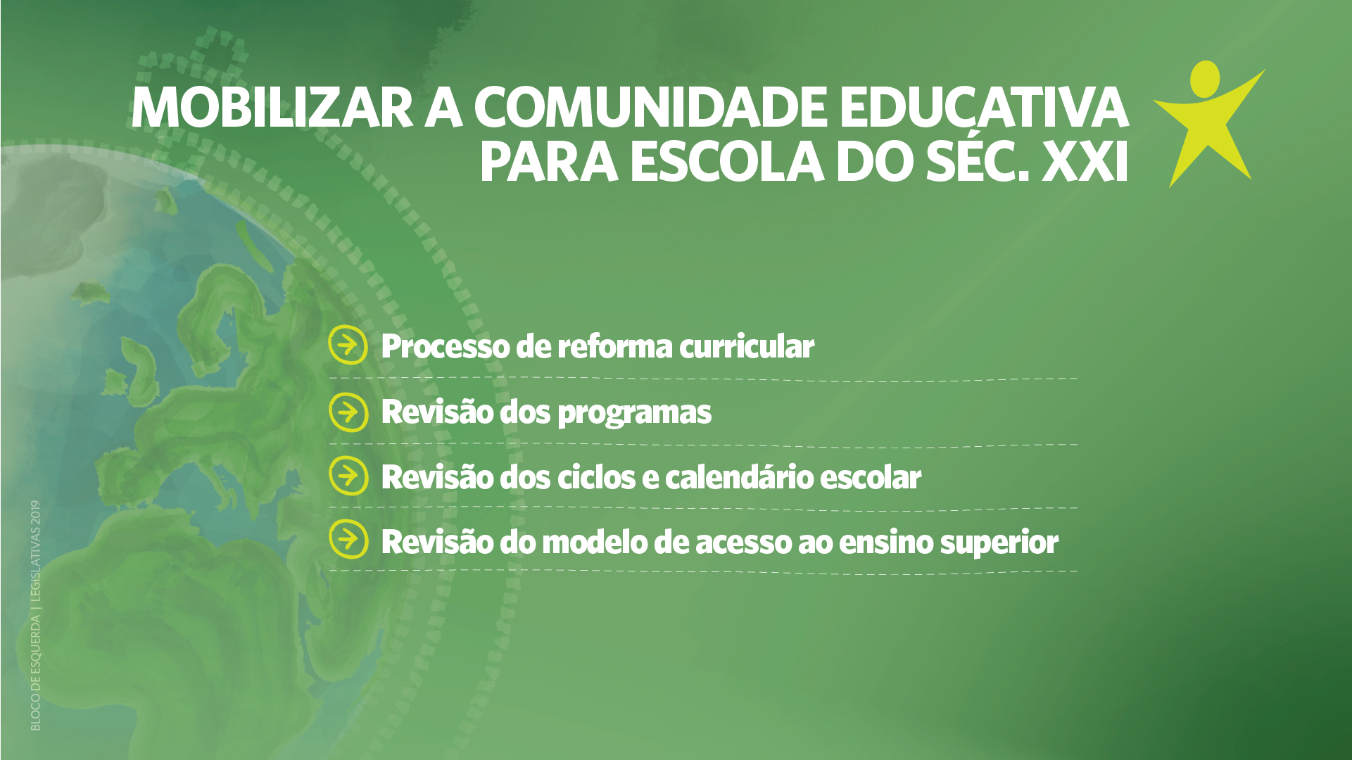 O Bloco pretende construir uma escola inclusiva, moderna e democrática que seja o contraponto à forma como a ideologia neoliberal “contaminou a Educação com a linguagem e o pensamento da gestão”, “acarretou a secundarização das Ciências Sociais” e o “retrocesso a uma educação tecnocrática, positivista e meritocrática, fortemente reprodutora das desigualdades sociais”.