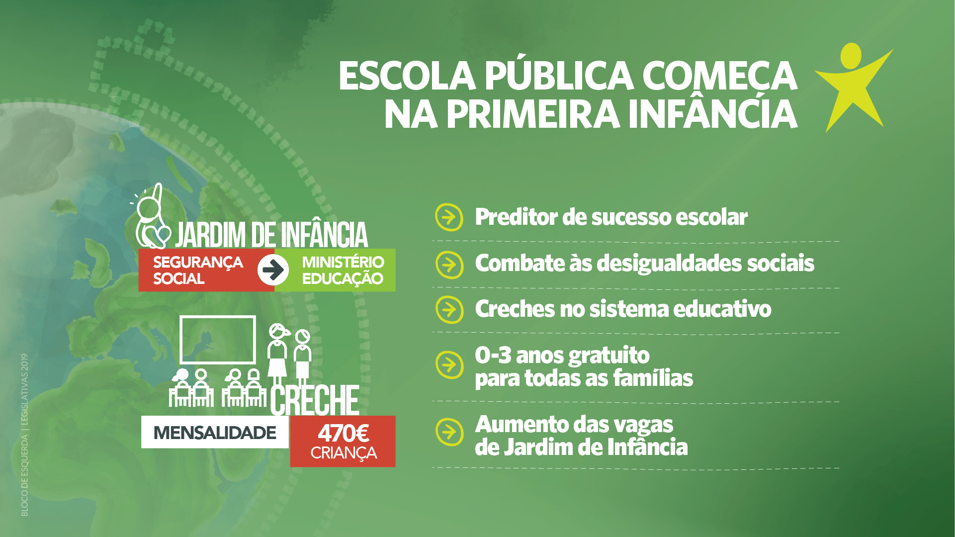 Para o partido, a escola pública começa na primeira infância pelo que se pretende a generalização do pré-escolar aos três anos e a inclusão das creches no sistema educativo porque “é mais caro ter uma criança na creche do que numa universidade privada”;