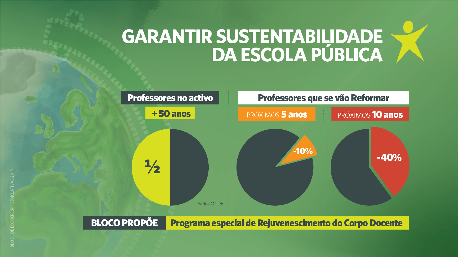É apresentado ainda um “Programa Especial de Rejuvenescimento do Corpo Docente” uma vez que “o envelhecimento da classe docente representa um risco para a sustentabilidade da Escola Pública e é um fator negativo para o desenvolvimento económico do país”. Este passa por “combinar uma aposta na formação inicial e no regresso de professores precários que abandonaram o sistema com o acesso à aposentação antecipada”.