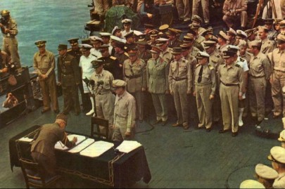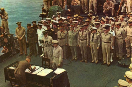 A rendição formal viria a ser assinada a 2 de Setembro, a bordo do USS Missouri, pelo general japonês Yoshijiro Umezu sob o olhar do homólogo norte-americano MacArthur (ao microfone). Foto Marinha dos EUA.
