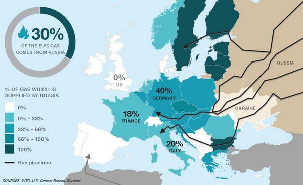 Aqui um mapa da percentagem de gás russo utilizado por cada país europeu. (Com este mapa é fácil compreender por que razão o Reino Unido quer uma “resposta dura” contra Putin enquanto a Alemanha prefere que “o conflito se atenue”).