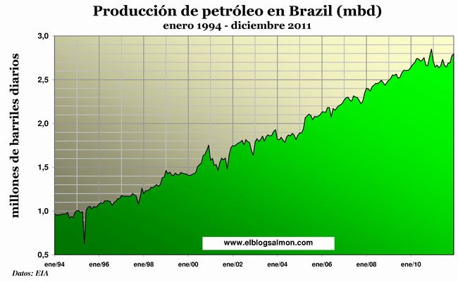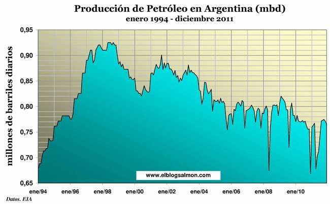 Nos gráficos seguintes, apresentamos a produção de petróleo da Argentina e do Brasil. Os dados são do Escritório de Informação energética dos Estados Unidos, EIA. O tema é candente para todo o mundo, devido ao alto preço a que chegou o crude, e para a Espanha, devido à expropriação da YPF à Repsol, empresa que há muitos anos estava a desinvestir na petrolífera, para distribuir lucros entre os seus principais acionistas: La Caixa e BBVA