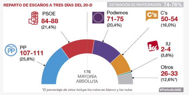 A última sondagem, divulgada nesta sexta-feira, 20 de dezembro de 2015, aponta para os seguintes resultados: PP, 25,8% e 107 a 111 deputados; PSOE, 21,4% e 84 a 88 mandatos; Podemos (incluindo as candidaturas unitárias de Catalunha, Comunidade Valenciana e Galiza) com 20,4% e 71 a 74 deputados; Ciudadanos, 16% e 50 a 54 mandatos; Izquierda Unida (sem contar com os seus resultados nas candidaturas unitárias de Catalunha, Comunidade Valenciana e Galiza), com 3,8% e 2 a 4 mandatos; e, finalmente, os restantes partidos com 12,6% e 26 a 33 deputados (nos restantes partidos é de salientar EH Bildu e PNV do País Basco; ERC e DIL da Catalunha; BNG da Galiza; Geroa Bai de Navarra, e Coligação Canária).