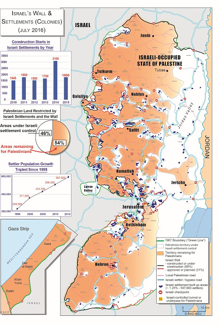 Este ano cumpre-se o cinquentenário da ocupação israelita na Cisjordânia (na Faixa de Gaza terminou em 2005) na sequência da Guerra dos Seis Dias. Uma ocupação sempre a esticar limites e com uma população de colonos a aumentar. Quase 600 mil colonos num território com cerca de 2,5 milhões de palestinianos. Na Cisjordânia, palestinianos e colonos vivem separados por muros, vedações e postos de controlo. Os colonatos têm estradas privadas que os ligam entre eles e a Israel, estão protegidos por perímetros de segurança, postos de controlo, fixos e móveis. Toda a margem fértil do Rio Jordão está ocupada por colonos e empresas israelitas. O exército israelita garante a ocupação.