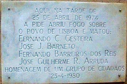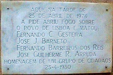 A placa com o nome das últimas vítimas da polícia fascista foi colocada a 25 de abril de 1980 na entrada do edifício com a seguinte inscrição: «Aqui, na tarde de 25 de Abril de 1974, a PIDE abriu fogo sobre o povo de Lisboa e matou: Fernando C. Gesteira, José J. Barneto, Fernando Barreiros dos Reis, José Guilherme R. Arruda. Homenagem de um grupo de cidadãos. 25-4-1980».