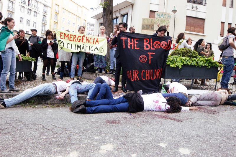 “Não podemos ficar indiferentes a um evento que apresenta o “Roteiro para a Neutralidade Carbónica 2050”, com a sua meta temporal irrealista, como solução para a ruína climática que se avizinha”, diz o movimento em comunicado publicado após a ação que pretendeu alertar o ministro português do Ambiente para “o sangue que será derramado por milhares e milhares de pessoas, cidadãos nacionais e estrangeiros, bem como de todos os seres vivos, nascidos e por nascer, vítimas de um sistema que nos está a encaminhar para a Extinção”.