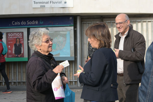 Numa ação realizada pelo Bloco de Esquerda na estação lisboeta do Cais do Sodré, onde chegam utentes vindos de barco, comboio, metro, autocarro e elétrico, Catarina Martins distribuiu materiais de informação sobre as mudanças tarifárias na região, que permite aos utentes deslocarem-se a partir desta segunda-feira em toda a área metropolitana por um preço máximo de 40 euros mensais.