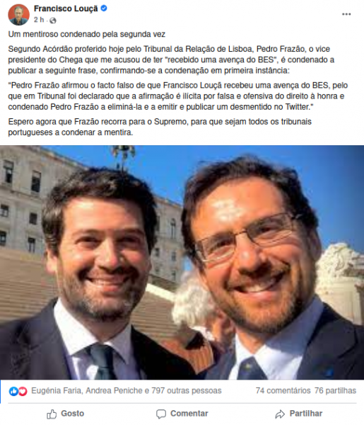 “Pedro Frazão afirmou o facto falso de que Francisco Louçã recebeu uma avença do BES, pelo que em Tribunal foi declarado que a afirmação é ilícita por falsa e ofensiva do direito à honra e condenado Pedro Frazão a eliminá-la e a emitir e publicar um desmentido no Twitter".