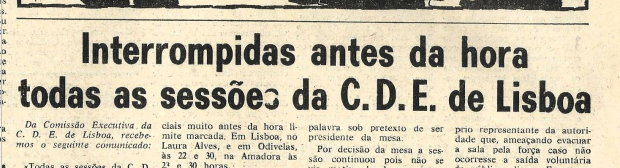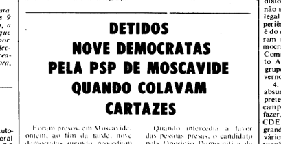 “Foram presos, em Moscavide, ontem, ao fim da tarde, nove democratas quando procediam à afixação de cartazes de propaganda eleitoral da CDE de Lisboa. Com efeito, cerca das 20h30, na Avenida Principal, os referidos democratas foram surpreendidos com a chegada de uma carrinha da polícia com quatro agentes, dois deles à paisana, os quais, não obstante os protestos dos detidos, meteram os democratas dentro da carrinha, conduzindo-os ao Governo Civil, depois de uma curta passagem pela esquadra local.