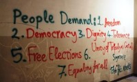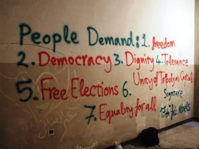 Esta fotografia foi obtida em Benghazi (Líbia) em Fevereiro de 2011. As expectativas expressas nesta parede de um comité revolucionário são elucidativas do que os líbios pretendiam ao lutarem contra Kadhafi. Depois, a história mudou de rumo.