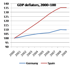 Estes afluxos de capital volumosos criaram um problema clássico de transferência: provocaram o aumento da procura de bens e de serviços espanhóis e um crescimento da inflação mais elevado neste país do que nos países com superavit, como a Alemanha. Segue uma comparação dos deflatores do PIB (de notar que ambos os países pertencem à Zona Euro, portanto a divergência reflecte o aumento dos preços relativos em Espanha):