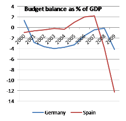 Onde param os deficits orçamentais no meio de tudo isto? A situação orçamental espanhola era risonha durante os anos de crescimento, agora apresenta deficits gigantescos. Mas estes deficits são uma consequência e não a causa da crise: a receita fiscal afundou-se e o governo gastou algum dinheiro a remediar o desemprego. Eis o panorama: