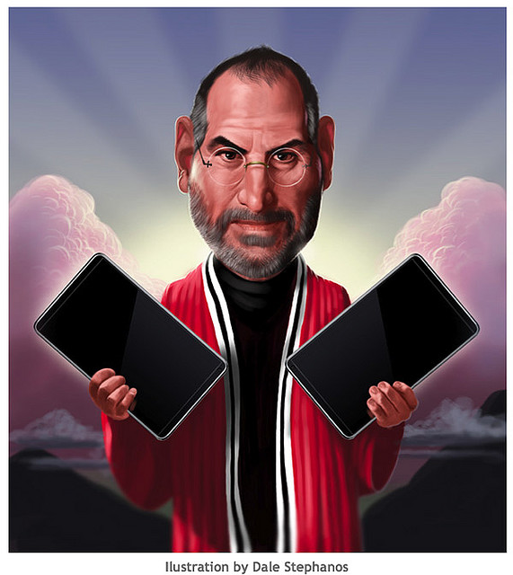 Toda a lenda de santidade incorpora vários elementos: predestinação, doutrina, fiéis, milagre/redenção, tentação/traição, engano, paixão, morte e ressurreição, o legado, a comunidade. Não é surpreendente o zelo com que meios de comunicação cultivam o mito de São Steve. Contudo, tudo isto revela muito pouco sobre Steve Jobs. Daqui a uns uns anos ou meses começarão a ouvir-se vozes críticas e no seu monumento, mais cedo ou mais tarde, alguém – assim está escrito nas leis dos meios de comunicação – deixará uma mijada. Então recordar-se-á que a Apple, numa altura de maior valor no mercado (153,29 mil milhões de dólares) deve o seu crescimento a uma filosofia empresarial que não fez caso da protecção do meio ambiente nem dos direitos laborais e humanos, do tratamento justo dos seus concorrentes e, em último lugar, da honestidade para com os clientes. Jobs abriu o messianismo da sua personalidade e dos seus produtos nos seus anúncios publicitários onde os produtos da concorrência era mostrados como o paradigma do mal e do estado de vigilância orwelliano, enquanto que os produtos claros da Apple apreciam como objectos da resistência.