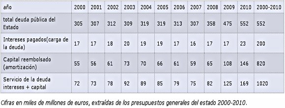 O estudo minucioso dos orçamentos gerais do Estado (acessíveis através da página do Ministério da Economia e Finanças) permite averiguar a quantidade de dinheiro gasta pelo Estado espanhol a título de reembolso de capital durante os últimos anos. Por exemplo, o reembolso de capital para o ano de 2010 é comparável ao orçamento total para esse ano. Se somarmos os juros e capital pagos ultimamente verificamos que, entre 2000 e 2010, o Estado reembolsou três vezes mais do que devia em 2000, e continua a dever quase o dobro. Esta tabela permite ver ainda como os juros e o capital reembolsados assim como a dívida total não pararam de aumentar desde o ano 2000, e com a atual especulação sobre a dívida da Espanha, esta tendência não vai mudar.