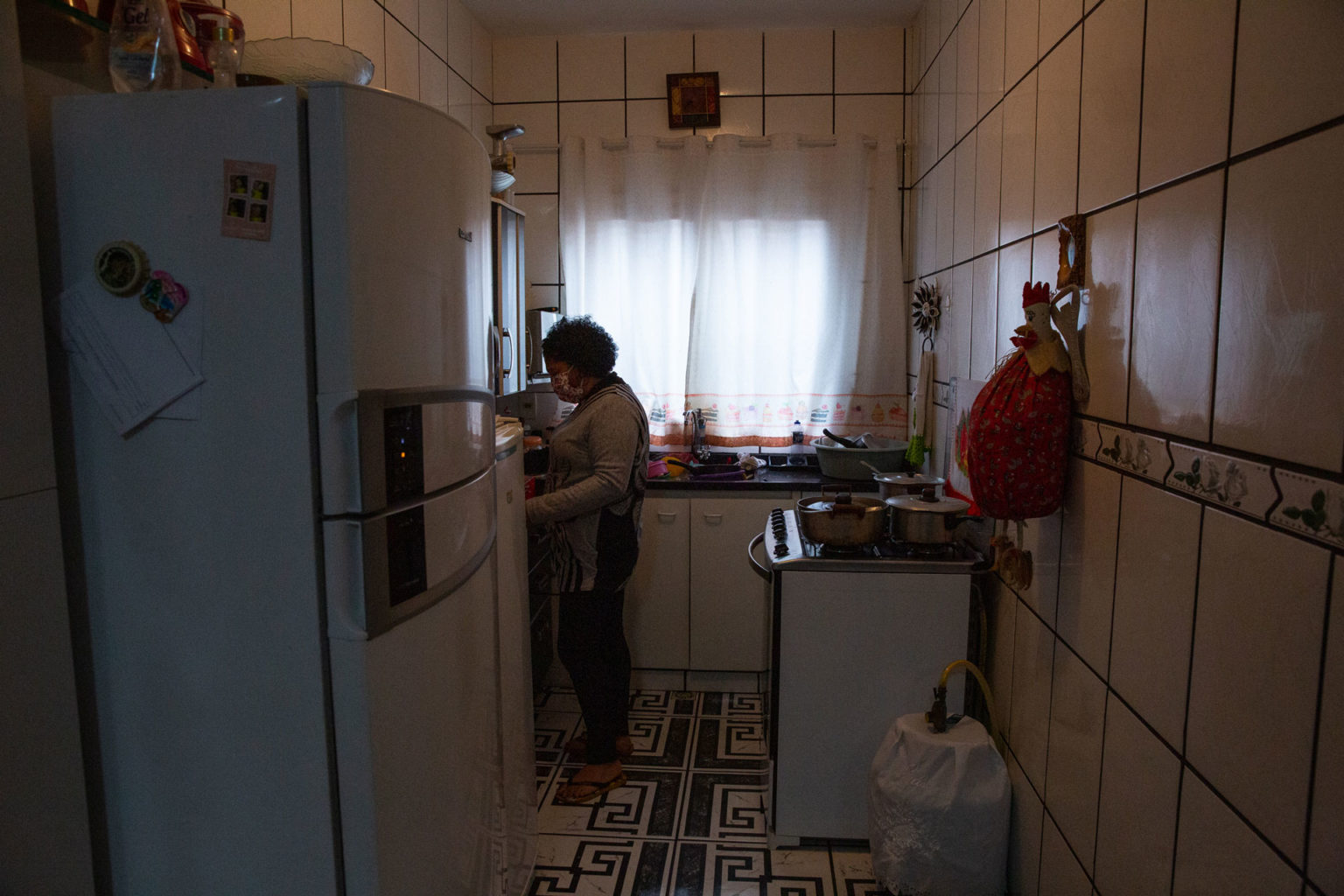 Jacira mora com o filho e o neto no Jardim Iracema, na região do Campo Limpo, zona sul. Ela é a única que está trabalhando no momento. Não recebe Bolsa Família, mas o filho, desempregado há seis meses, conseguiu os 600 reais do auxílio de emergência. A situação financeira só não está pior porque os seus dois serviços diários garantem a alimentação dentro de casa, reforçada por uma cesta básica que recebeu de doação. “Está apertado, mas ainda temos o que comer. O meu rendimento renda caiu pela metade. Estou a tentar pagar as contas de água e de luz, ajustando um pouco aqui ou ali e assim vai indo”, relata.