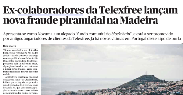 Fala do caso Telexfree, uma empresa que, segundo o Público, "entre 2012 e até meio de Abril de 2014, começou a apresentar-se como um negócio de venda de pacotes ‘VoIP’, uma tecnologia que utiliza a internet como alternativa à rede fixa de telefone". E que acabou por se manifestar como uma empresa em esquema Ponzi.