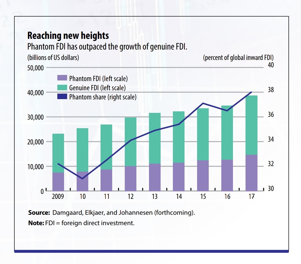 Em 2017, dois investigadores do Fundo Monetário Internacional (FMI), Philip Lane e Gian Milesi-Ferretti, olharam para os fluxos internacionais de capital e procuraram perceber quais eram as principais tendências dos últimos anos. O foco do estudo era o Investimento Direto Estrangeiro (IDE), o tipo de fluxo normalmente considerado preferível pelos países que o recebem, por estar associado a investimentos de longo prazo e transferência de tecnologia e conhecimento do exterior, o que o torna mais estável do que os investimentos de carteira. Mas o cenário encontrado pelos autores foi bastante diferente: grande parte dos fluxos de IDE constitui investimento “fantasma” movido por engenharia financeira, sem relação com atividades produtivas nos locais onde o dinheiro é colocado. Como explicação para esta tendência, apontaram a "complexidade da estrutura organizacional de empresas multinacionais", que lhes permite desviar fundos para offshores onde pagam menos (ou nenhuns) impostos.