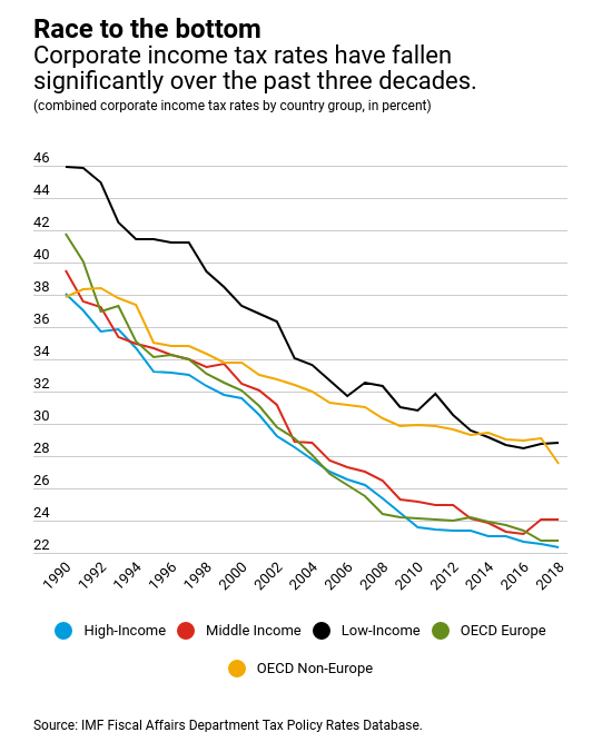 Yellen explicou que pretende "chegar a um acordo sobre uma taxa mínima de imposto sobre as empresas, o que poderá acabar com a corrida para o fundo" na tributação empresarial, área em que, nas últimas décadas, se tem assistido a uma progressiva redução das taxas de imposto efetivas. Já Jake Sullivan, conselheiro para a Segurança Nacional dos EUA, disse que "uma parte central da nossa estratégia de segurança nacional é a competitividade nacional: criar empregos e aumentar os salários a nível interno, e não incentivar os paraísos fiscais". Na verdade, a corrida para o fundo tem sido alimentada por uma visão enganadora da competitividade nacional que assenta na ideia da "concorrência fiscal" entre os países. Na prática, esta ideia favorece a criação de regimes especializados em captar receita fiscal devida noutras paragens e coloca pressão sobre os restantes. O resultado é o que se pode ver no gráfico em baixo: ao longo das últimas décadas, as grandes empresas têm pago taxas de imposto cada vez mais baixas.