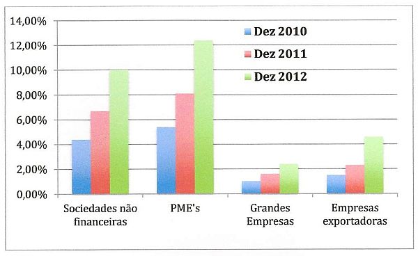 No caso das empresas, a evolução tem sido pouco menos que explosiva. O rácio de crédito vencido atingiu 10% em Dezembro passado (e 10,3% em Janeiro deste ano, com 29% dos devedores em incumprimento). Mais uma vez, as medidas de austeridade não atingiram todos por igual: o maior (e mais preocupante) salto regista-se nas PMEs em que este rácio ultrapassa já os 12% e, curiosa e triste constatação, o sector exportador, em que este indicador duplicou durante 2012.