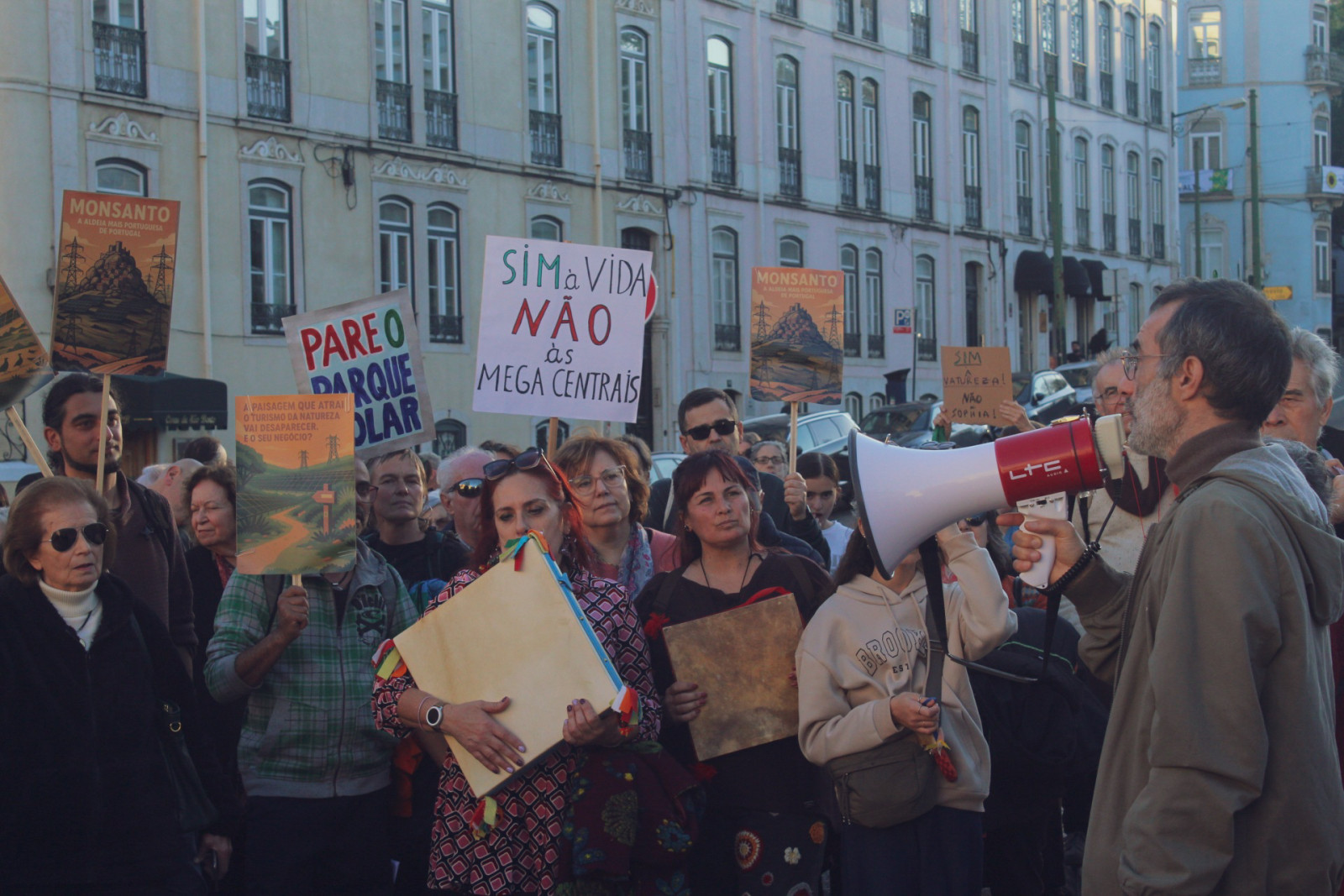 Ao som dos bombos, chocalhos e adufes e cânticos da região, habitantes do Fundão, Idanha-a-Nova, Penamacor, Castelo Branco e outros concelhos da Beira Baixa vieram a Lisboa manifestar oposição à construção dos projetos de megacentrais solares Sophia - com 1.700 hectares - e Beira - com 675 hectares.