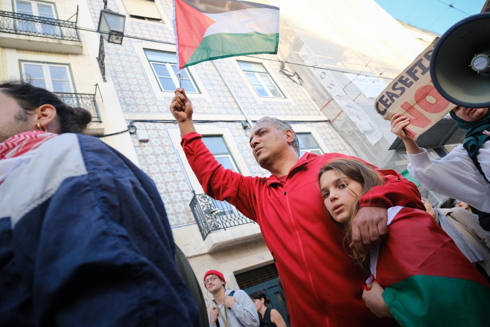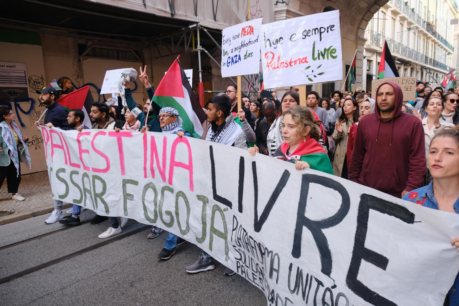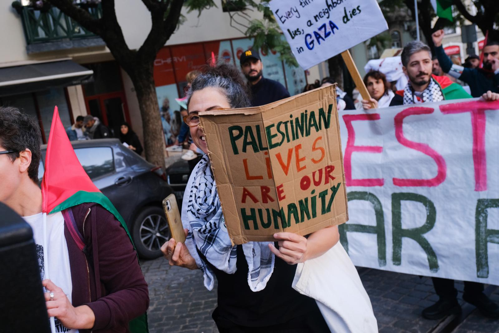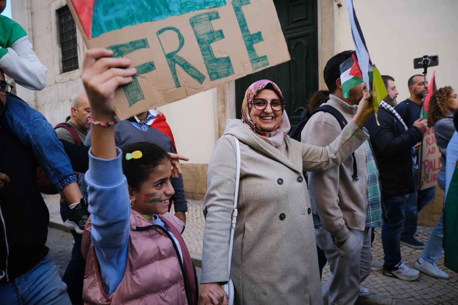Este sábado, milhares de pessoas saíram às ruas de Lisboa para exigir um cessar-fogo e liberdade para a Palestina. Fotos de Ana Mendes.