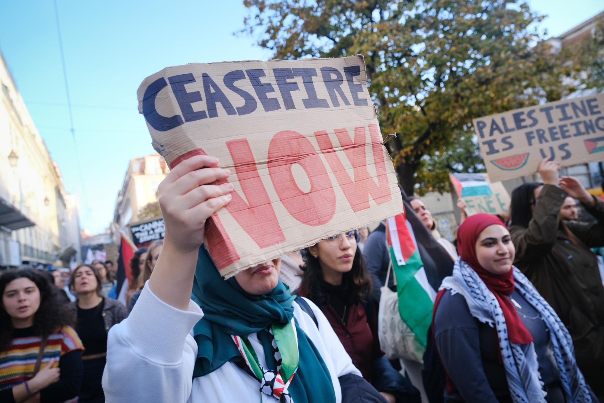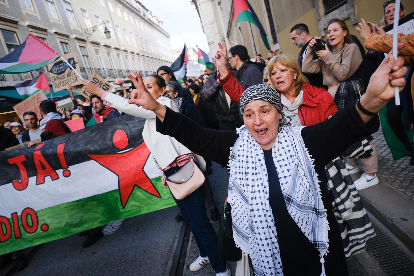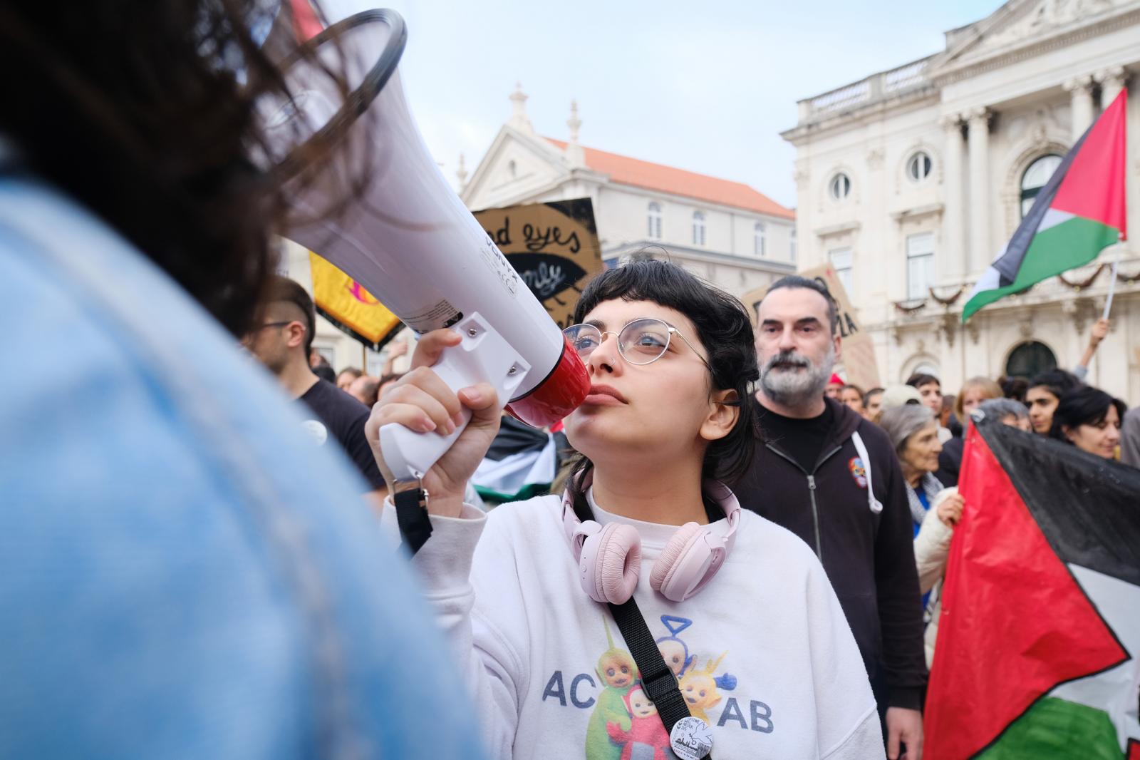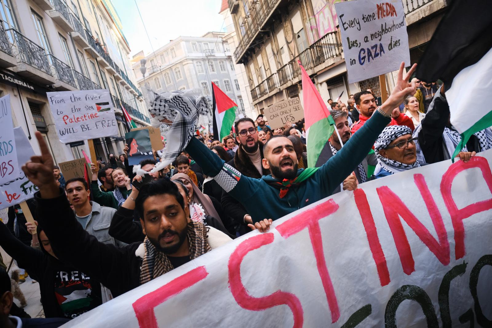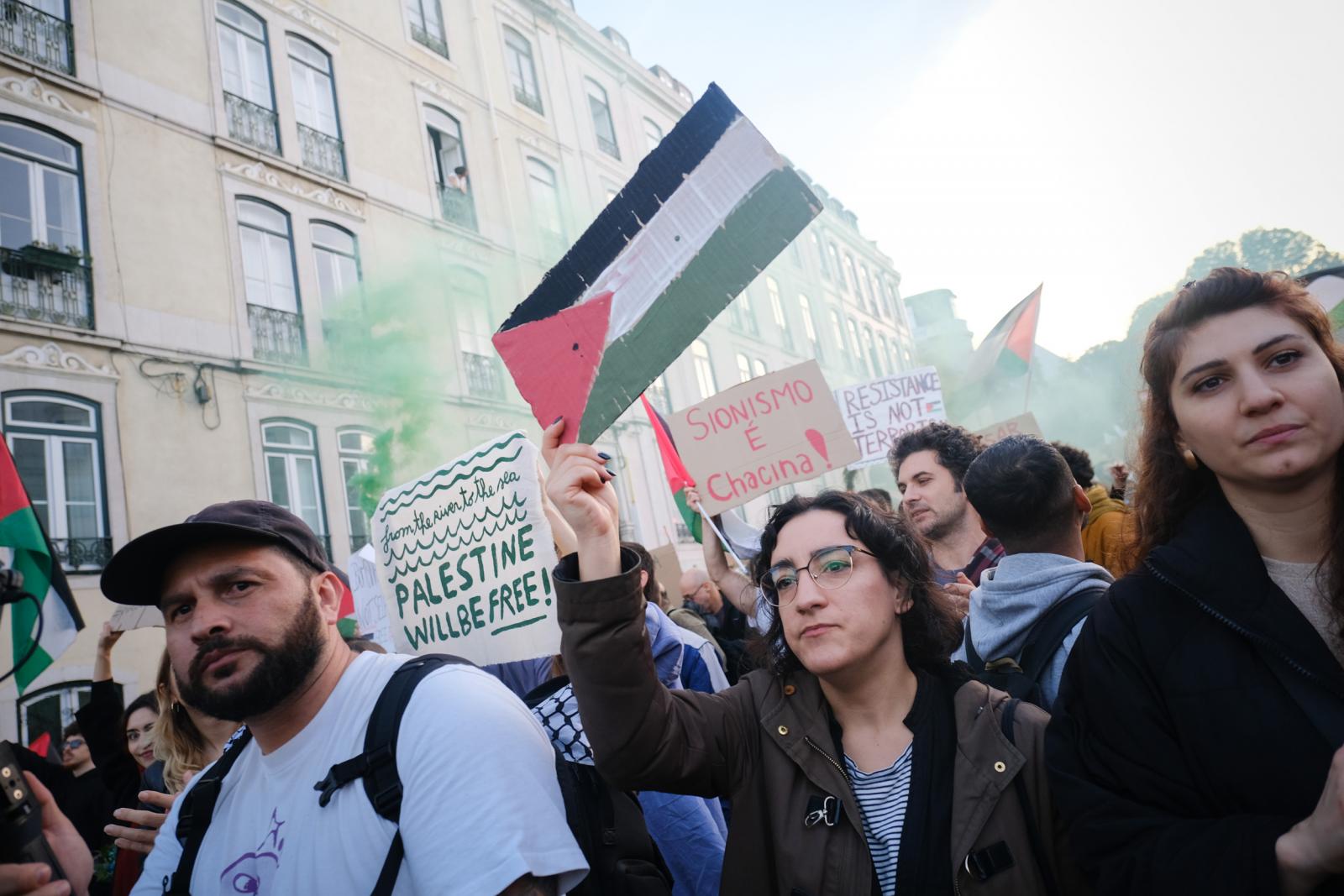 Este sábado, milhares de pessoas saíram às ruas de Lisboa para exigir um cessar-fogo e liberdade para a Palestina. Fotos de Ana Mendes.