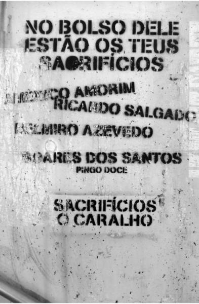 A censura praticada pelo diretor do ICS (Instituto de Ciências Sociais da Universidade de Lisboa), José Luís Cardoso, ao anular o último número da revista Análise Social devido ao ensaio visual2 “A Luta Voltou Ao Muro” produzido pelo investigador Ricardo Campos, foi justificada pelo “mau gosto e uma ofensa a instituições e pessoas que eu não podia tolerar” e porque uma das imagens detém “conteúdo obsceno, com ofensas de natureza pessoal” lê-se no comunicado publicado pelo diretor do ICS no website. A única expressão que parece constituir ofensa é a que está visível na reprodução de um stencil e que diz: “sacrifícios o caralho”. Segundo o dicionário Houaiss, esta interjeição é uma “expressão que indica indignação” ou “admiração, entusiasmo”, nada de ofensivo portanto! A não ser que tomemos a expressão da indignição como uma ofensa pública que deva ser criminalizada? De facto estamos à beira disso poder vir a acontecer, veja-se a polémica lei espanhola de Seguridad Ciudadana, conhecida como “ley mordaza”3. Parece óbvio estarmos todos conscientes do que representa esta escalada da violência do Estado sobre os cidadãos, da militarização do ciberespaço à vigilância ubíqua, da austeridade ideológica ao abuso da força policial. Obviamente, repito, estamos de acordo que isto significa a diminuição dos direitos e liberdades e o ataque à soberania popular e constitucional, ou não? E qual o papel das instituições sociais em tempos de crise como aquela em que vivemos? Recusar a vox populi para não conspurcar as suas esbeltas páginas preenchidas de pertinentes teses académicas?