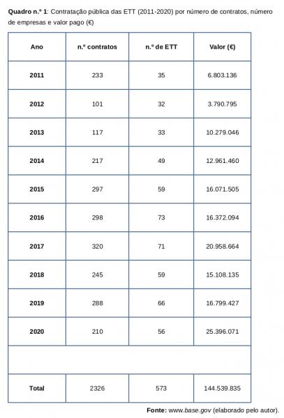 A história dos precários nesta pandemia poderia ter terminado no primeiro confinamento, em março de 2020, com a dura realidade do desemprego e da precariedade. Todavia, a pandemia veio revelar a fragilidade estrutural do Estado em responder aos problemas criados. Na linha da frente, foi o recurso ao trabalho precário e temporário que segurou o país na pior fase da pandemia. Basta analisar os ajustes diretos realizados pelo Estado para percebermos a dimensão do fenómeno. Em 2020, o Estado bateu recordes no recurso às ETT (56 no total), realizando 210 contratos pelo valor de 25 milhões e 300 mil euros. Apenas 6 ETT, a Randstad, a Egor, a Kelly Services, a Talenter, a Grandalvo e a Manpower concentraram 65% dos contratos e 75% das verbas pagas pelo Estado.